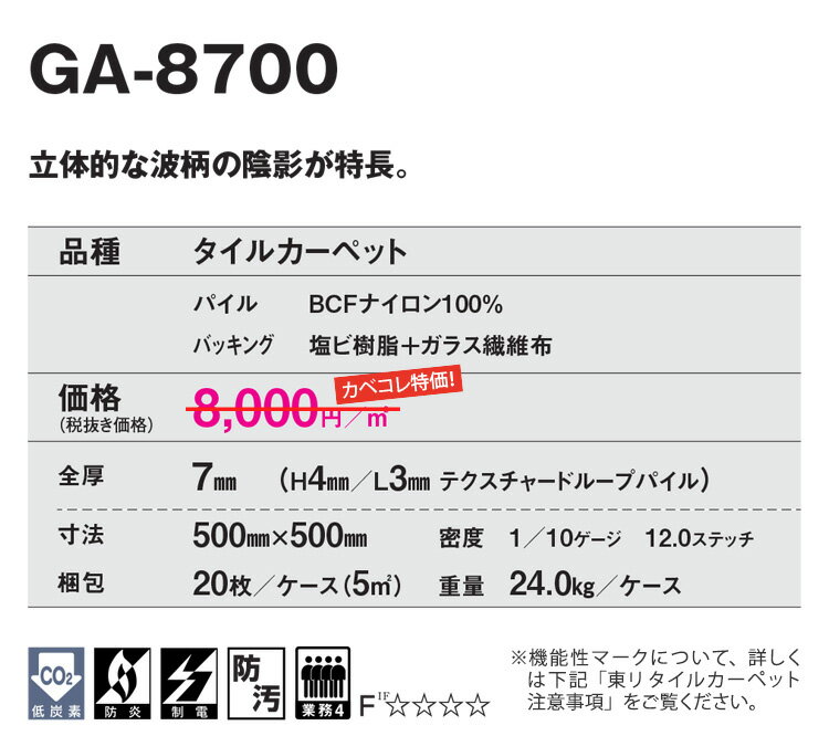 商品の詳しい情報ブランド名東リ:TOLI品種タイルカーぺットカーペットタイル商品名GA-8700(GA8700)商品PR立体的な波柄の陰影が特長。